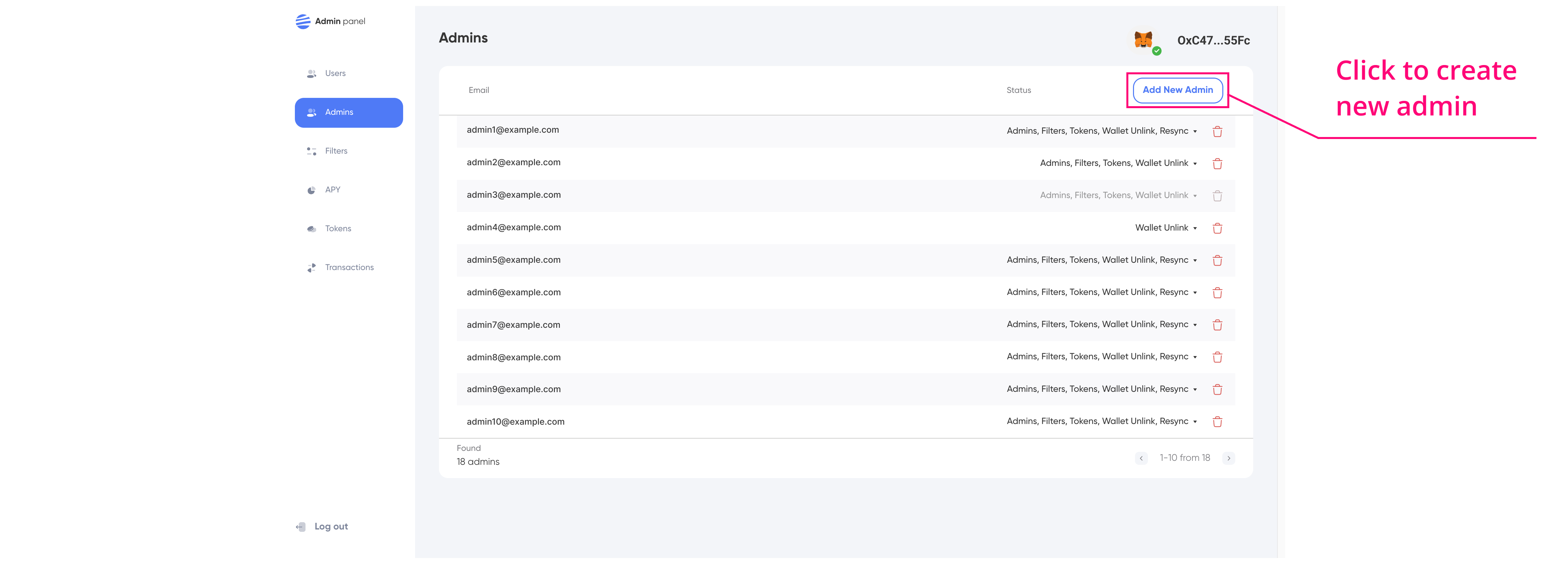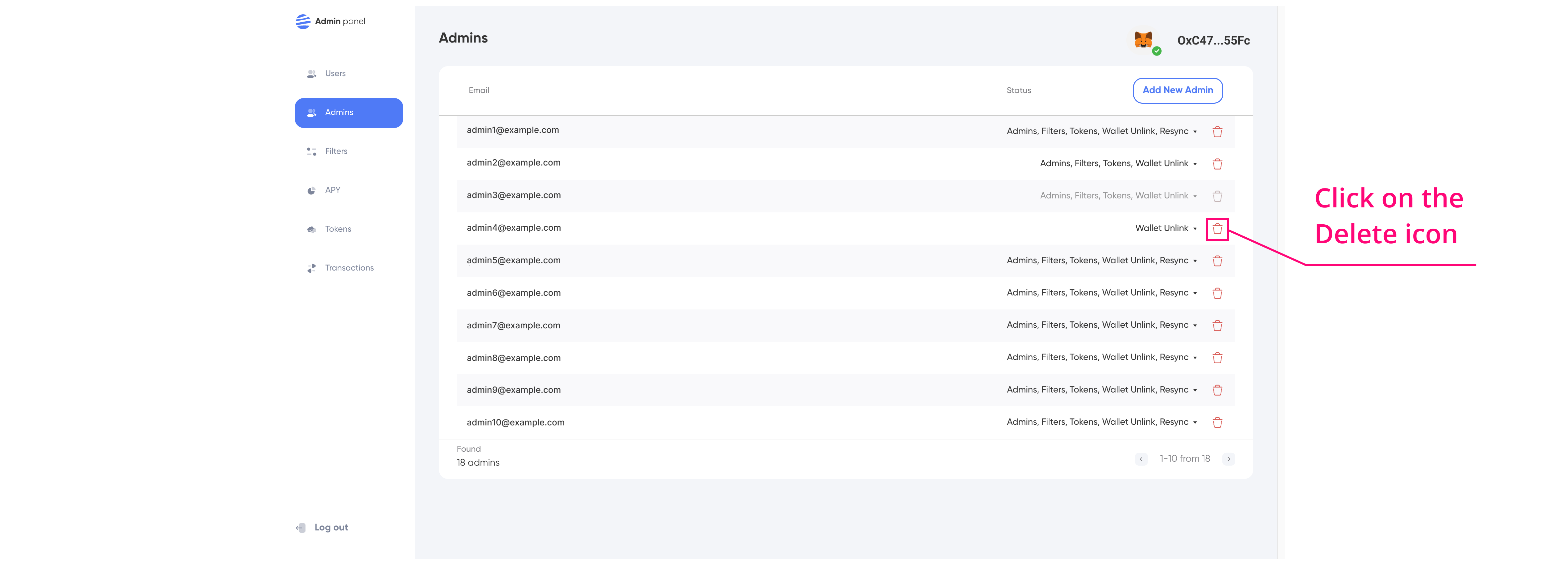 **Delete Admin:** In order to remove administrators, the administrator performing the action must possess the "Admins" permission. To initiate the deletion process, locate the "Delete" button adjacent to the desired administrator and click on it. Subsequently, a "Remove admin" popup will appear, prompting for confirmation. Click the "Yes" button within the popup to confirm and proceed with deleting the administrator.