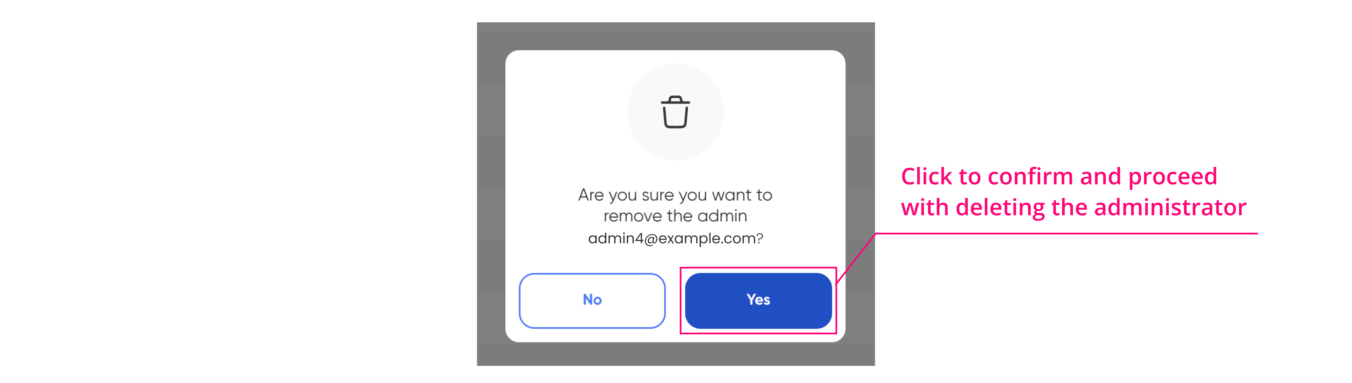 <figure><img src="https://2429038874-files.gitbook.io/~/files/v0/b/gitbook-x-prod.appspot.com/o/spaces%2FnZV5625by9KRD8Ru8vDf%2Fuploads%2FRDARZbCSpuhUDW49YR5c%2FAdmin%20Management_Delete%20Admin%20Pt2.png?alt=media&#x26;token=8042233f-4873-4cc6-9874-5c3ec662ff6c" alt=""><figcaption></figcaption></figure>