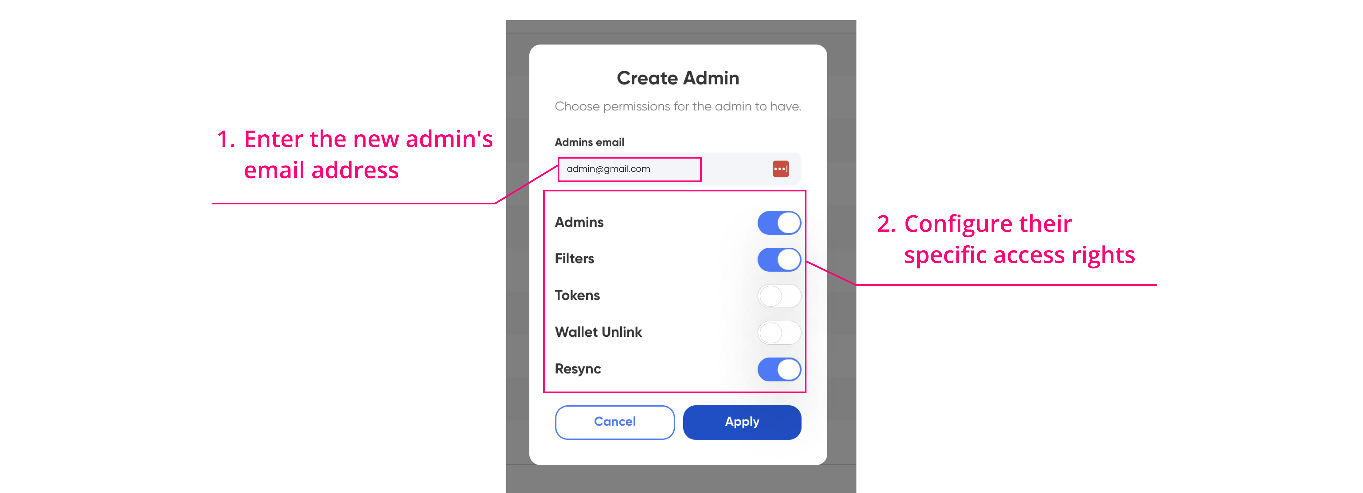 Within the Create Admin popup, you will be prompted to enter the new admin's email address and configure their specific access rights. The access rights options include: