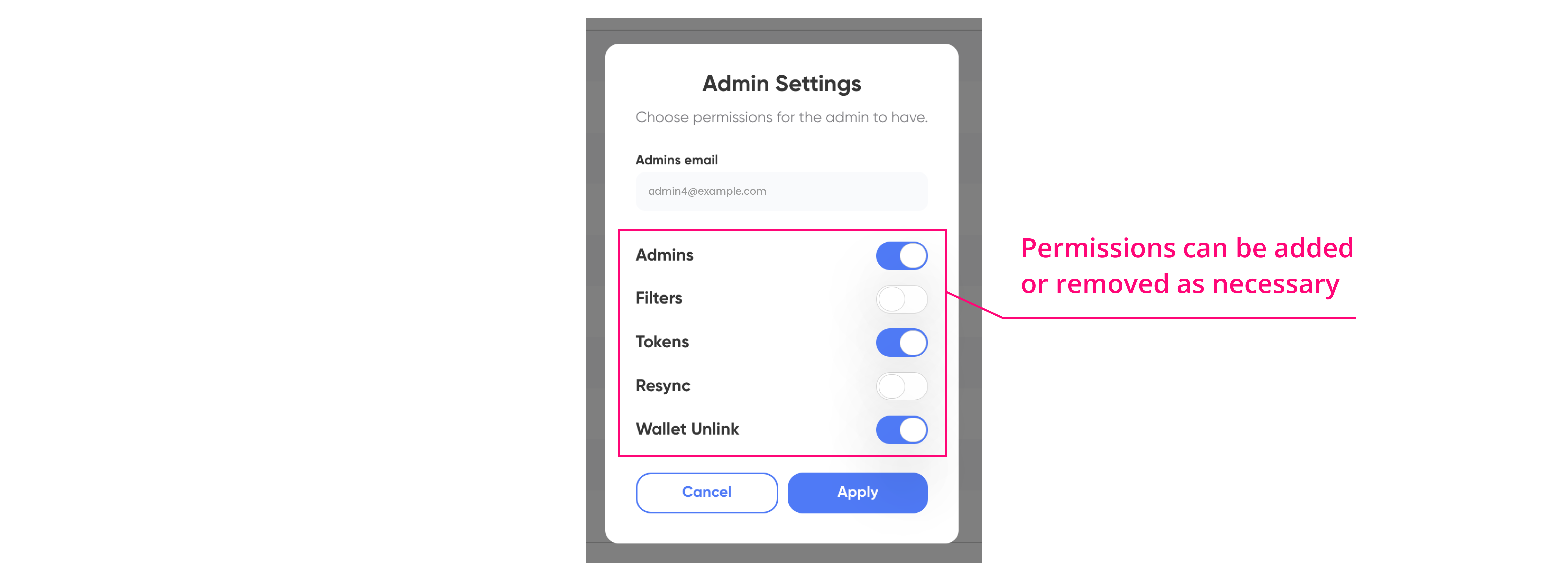 * Wallet Unlink: This permission allows administrators to disconnect user wallets from the platform, which proves useful when users need to link a different wallet to the platform.
